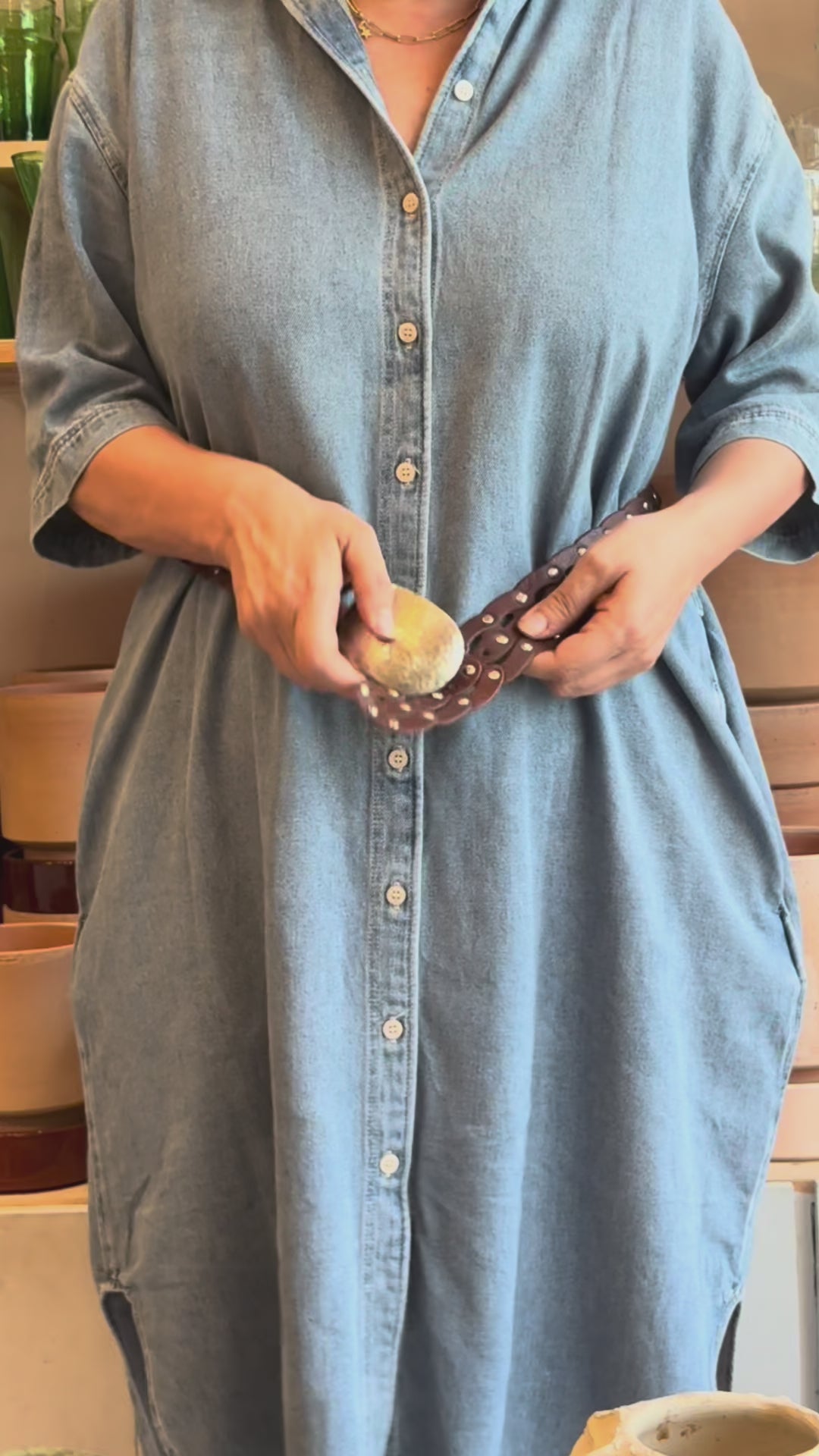 Meticulously created by skilled artisans, this belt is a true piece of wearable art. Hundreds of small leather links are intricately woven together and accented with antique-style metal studs, forming a flexible, eye-catching band that elevates any outfit.The standout feature is the hammered silver-tone buckle, designed with raw, organic texture for added character. A hidden hook beneath the buckle allows you to fasten the belt at any point along the leather links, offering a fully adjustable fit whether worn high at the waist or low on the hips.