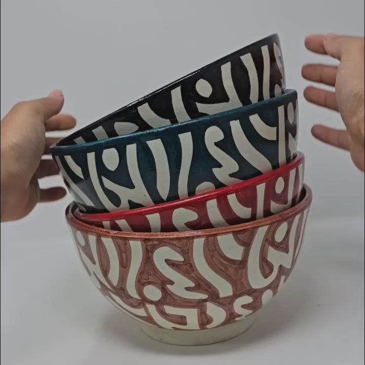 This set of hand-painted ceramic bowls is a beautiful blend of tradition and functionality. Made by skilled artisans in Morocco, each bowl features bold, vibrant brushstrokes in a choice of four stunning colours: Green, Red, Black, and Terracotta.